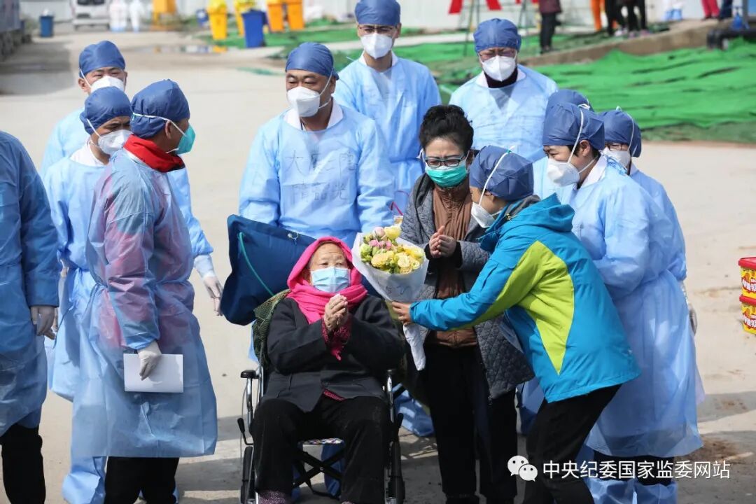 98岁高龄的胡汉英患者从武汉雷神山医院治愈出院。(陈亮 摄)