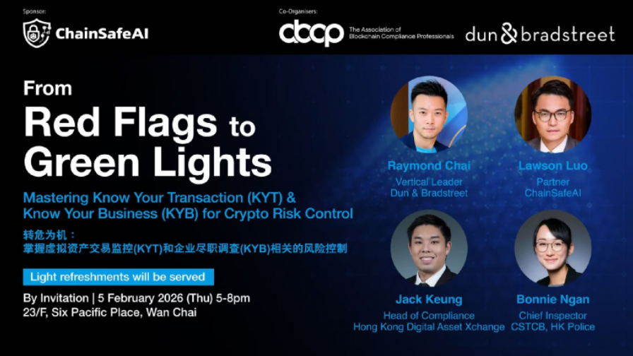 在此背景下,由ChainSafeAI赞助,Dun&Bradstreet(D&B)与ABCP联合主办的专业研讨会《转危为机:如何利用KYT优化加密资产客户的风险管理》,将于2026年2月5日在香港举行。